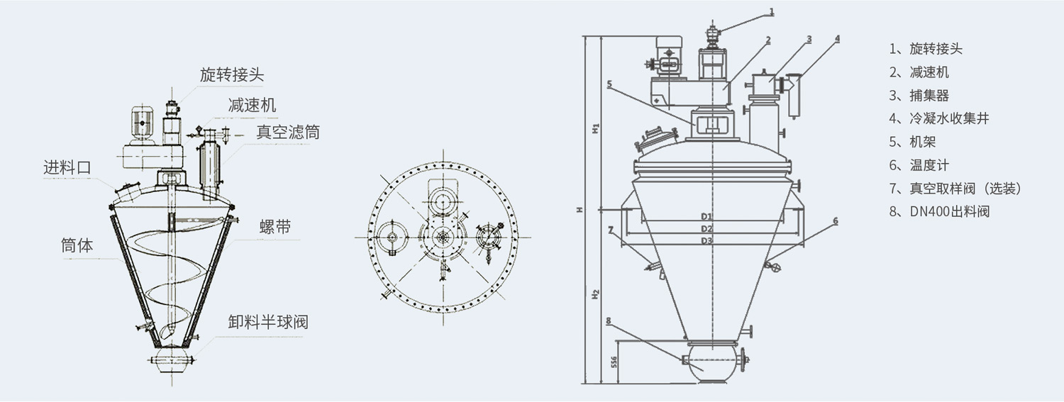 利用搅拌螺带将物料旋转提升,锥形夹套内同时通入传热介质,如热水、导热油、蒸汽等,使加热后的物料从四周提升并从中间下落,快速不断的循环翻转,并通过载气将湿份及时带走,使物料达到干燥和混合目的。并且在筒体内无任何传动机构,…